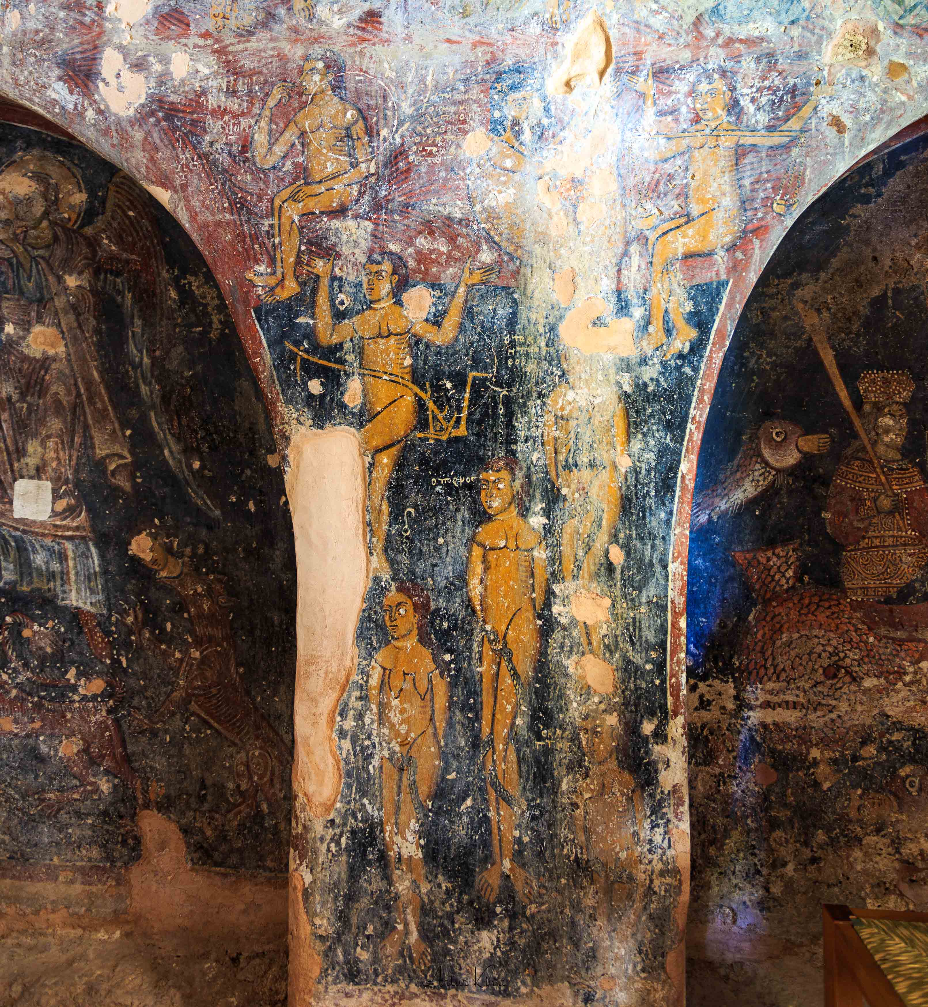 Za nimi pojawia się podgrupa oznaczona napisem ΟΙ ΑΡΕΙΑΝΉ – „arianie”. Wśród nich stoi nagi mężczyzna o rozdwojonej białej brodzie, ciągnący ją z rozpaczą: to Ariusz, archetyp heretyka. Obok niego jego zwolennicy, z których jeden przykrywa dłonią genitalia mistrza. Kolejna naga postać – trudna do jednoznacznej identyfikacji – reprezentuje jednego z pozostałych wielkich heretyków, Sabelliusza lub Macedoniusza.