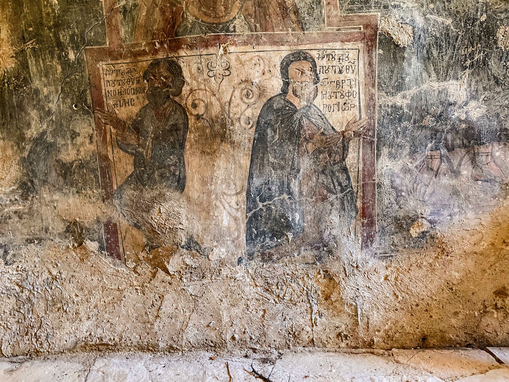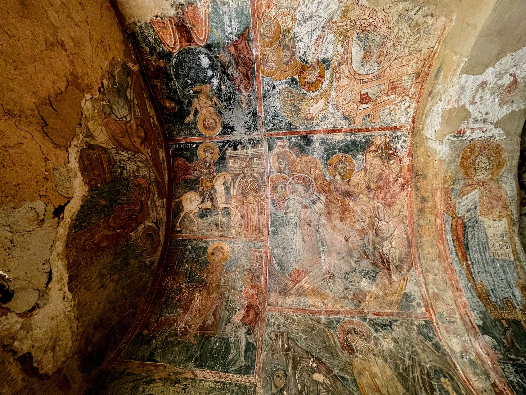 Program ikonograficzny obejmuje przede wszystkim sceny z życia Świętego Jerzego, a także klasyczny krąg chrystologiczny. Co szczególnie ciekawe, wśród malowideł pojawiają się również wizerunki fundatorów. Nie jest to wprawdzie zjawisko wyjątkowe w sztuce bizantyńskiej, ale zawsze stanowi cenną wskazówkę interpretacyjną. Obrazy te przypominają, że kościół nie był abstrakcyjną realizacją teologiczną, lecz bardzo konkretnym dziełem wspólnoty – ludzi, którzy tu żyli, modlili się i inwestowali swoje środki oraz wysiłek.