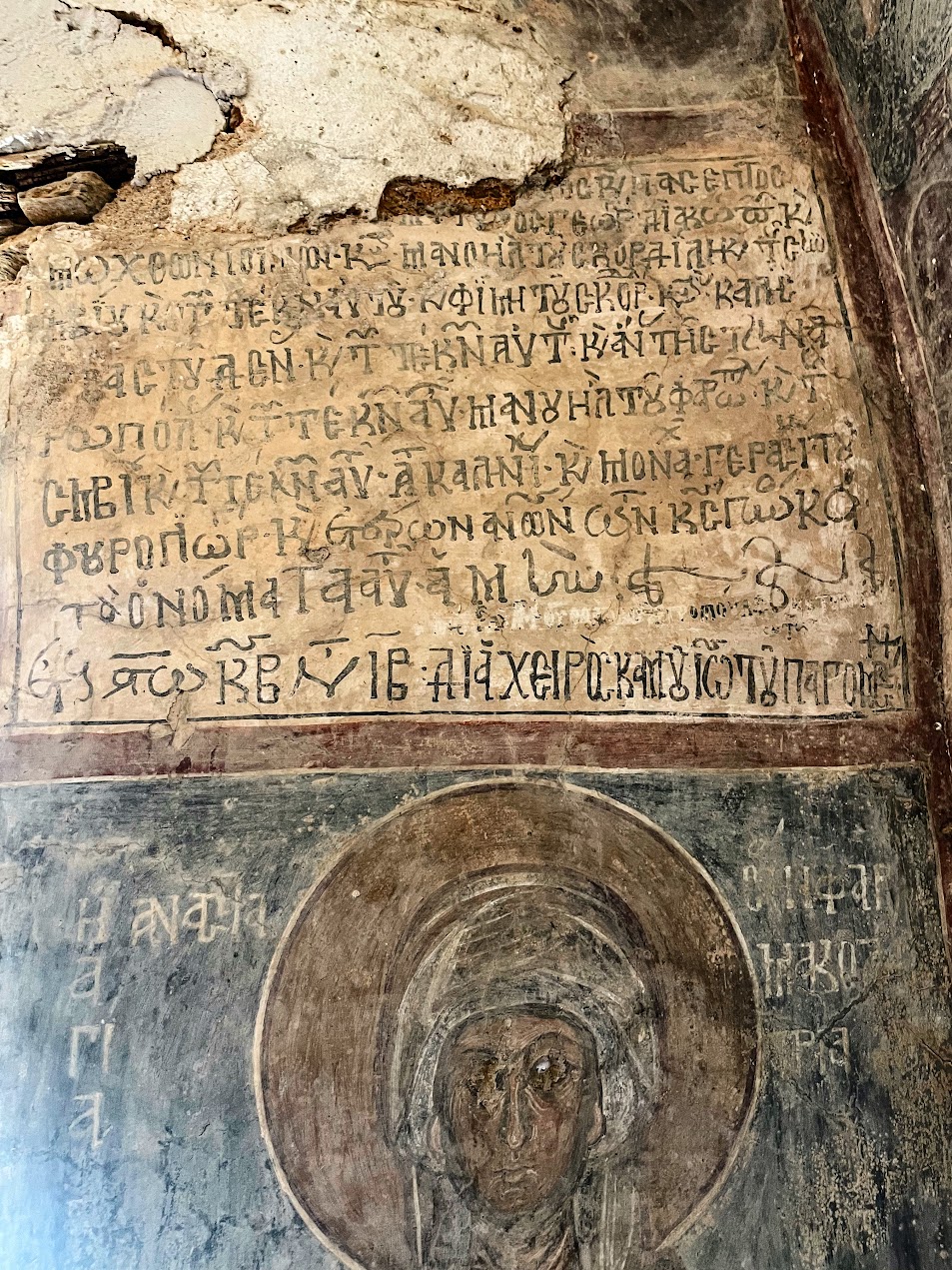 Zachowana tablica fundacyjna pozwala bardzo precyzyjnie osadzić dekorację malarską w czasie. Wskazuje ona na rok 1313/1314, a także informuje, że freski powstały wysiłkiem fundatorów i całej lokalnej społeczności. Co istotne, inskrypcja nie jest lakoniczna: wymienia konkretnych ludzi, w tym Manuela Skordylisa oraz Gerasimosa Fourogiorgisa, a także inne osoby, których imiona – jak zapisano – „zna Pan”. To rzadka sytuacja, w której anonimowa z pozoru świątynia zaczyna mówić bardzo ludzkim głosem.