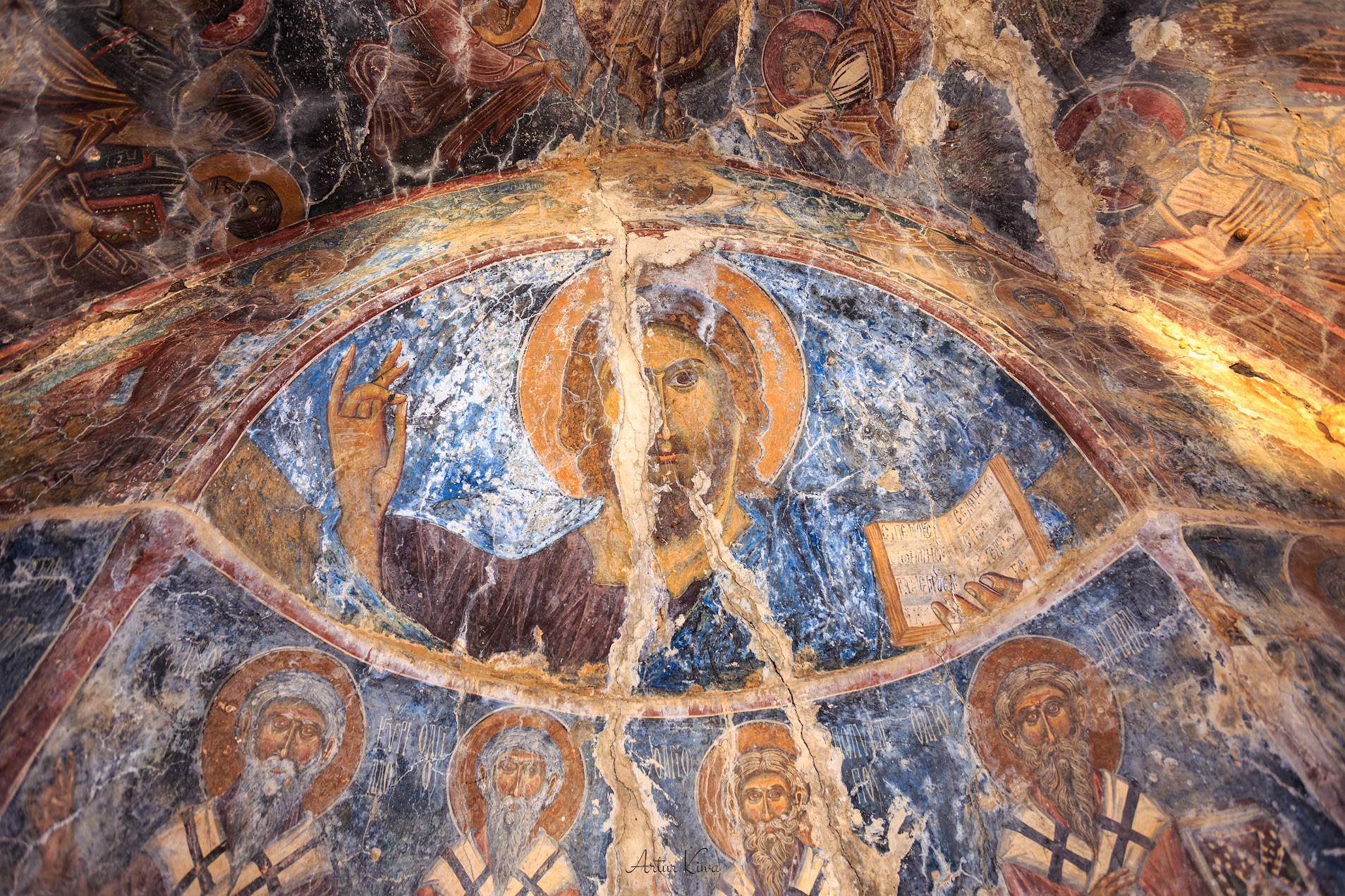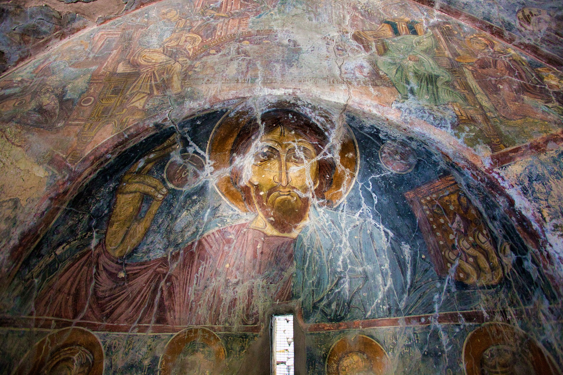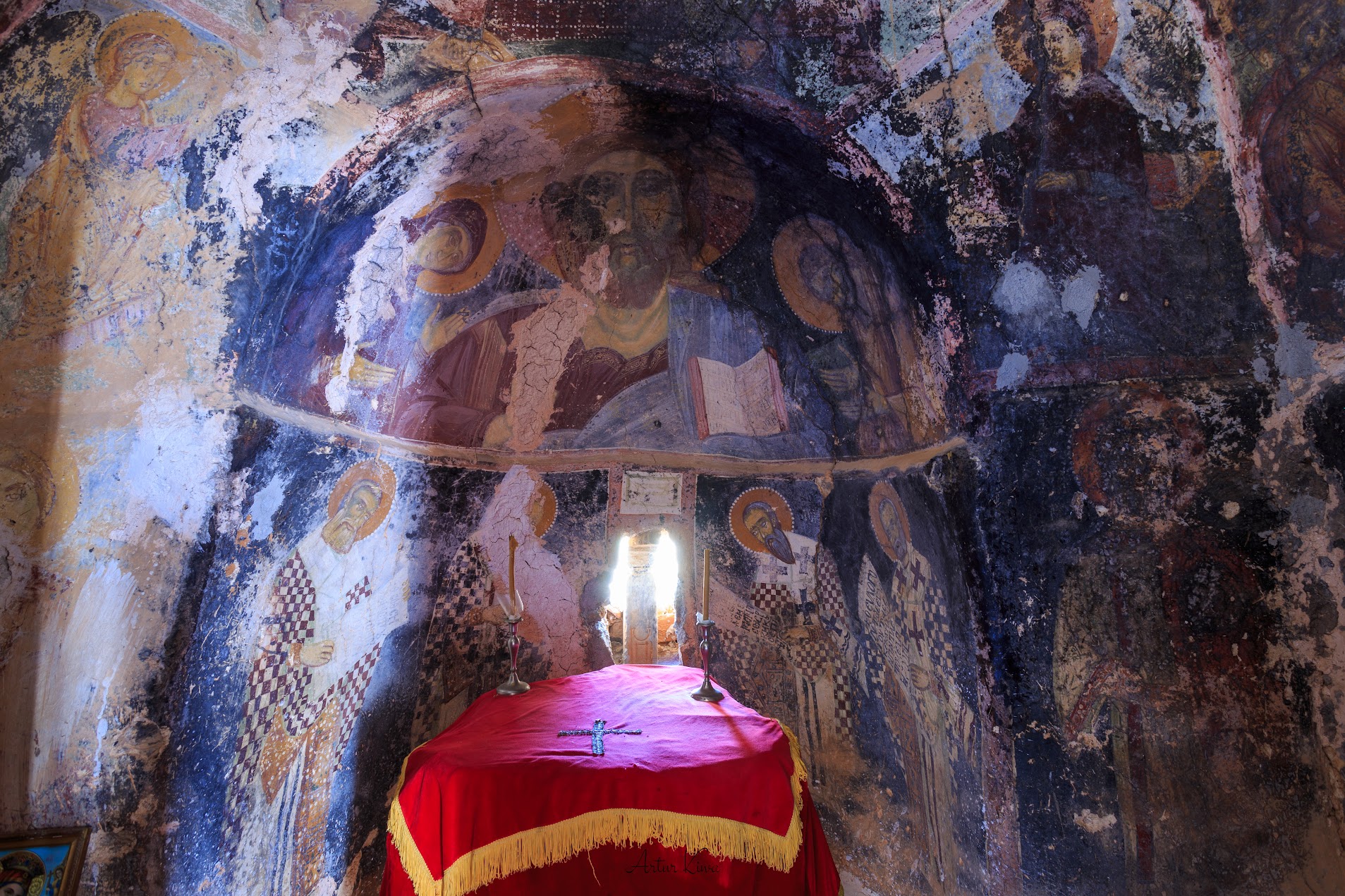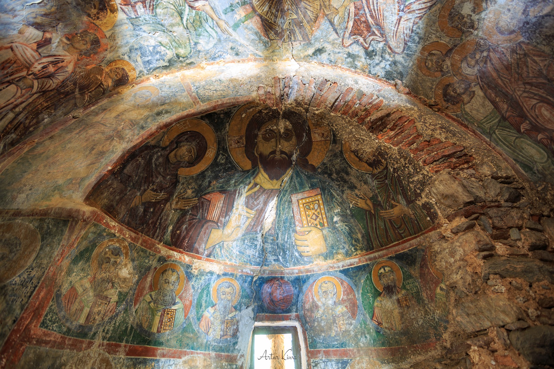 W Aradenie Pantokrator ma w sobie coś z pełni. Jest jaśniejszy, spokojniejszy, bardziej uporządkowany – nie dlatego, że stonowany, ale dlatego, że wyraźnie wpisany w rytm całej absydy. Światło padające z maleńkiego okna podkreśla delikatne linie twarzy i aureoli, jakby fresk nie tyle dominował nad przestrzenią, co w niej był zakorzeniony. W tym wizerunku nie ma surowości, jest coś innego – spójność. Idea, która trwa, bo jest prawdą, a nie bo ma pigment.